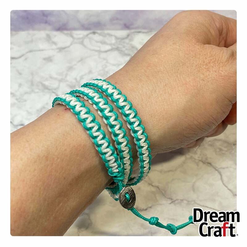 アクアグリーンを中芯にアクアグリーンとホワイト蓄光のマイクロコード(1.18mm)で平編みにしています。